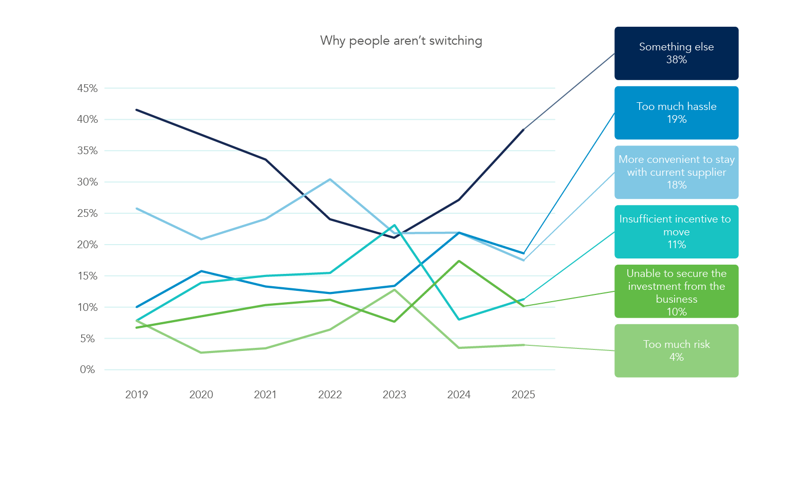 Of those who have considered switching but decided not to, 20% cite that it was too much hassle. This contrasts to our earlier findings where over 50% of respondents reported to now find switching easy (the highest level across all years). So even though the process of switching is perceived as simpler than before, for those who considered switching but didn’t, complexity remains a deterrent.