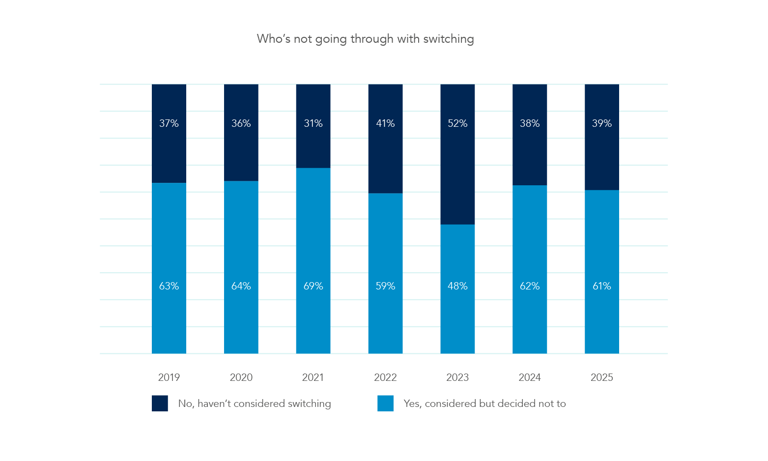 The majority of respondents still haven’t considered switching (61%). This is largely consistent with 2024 figures, suggesting loyalty is recovering.