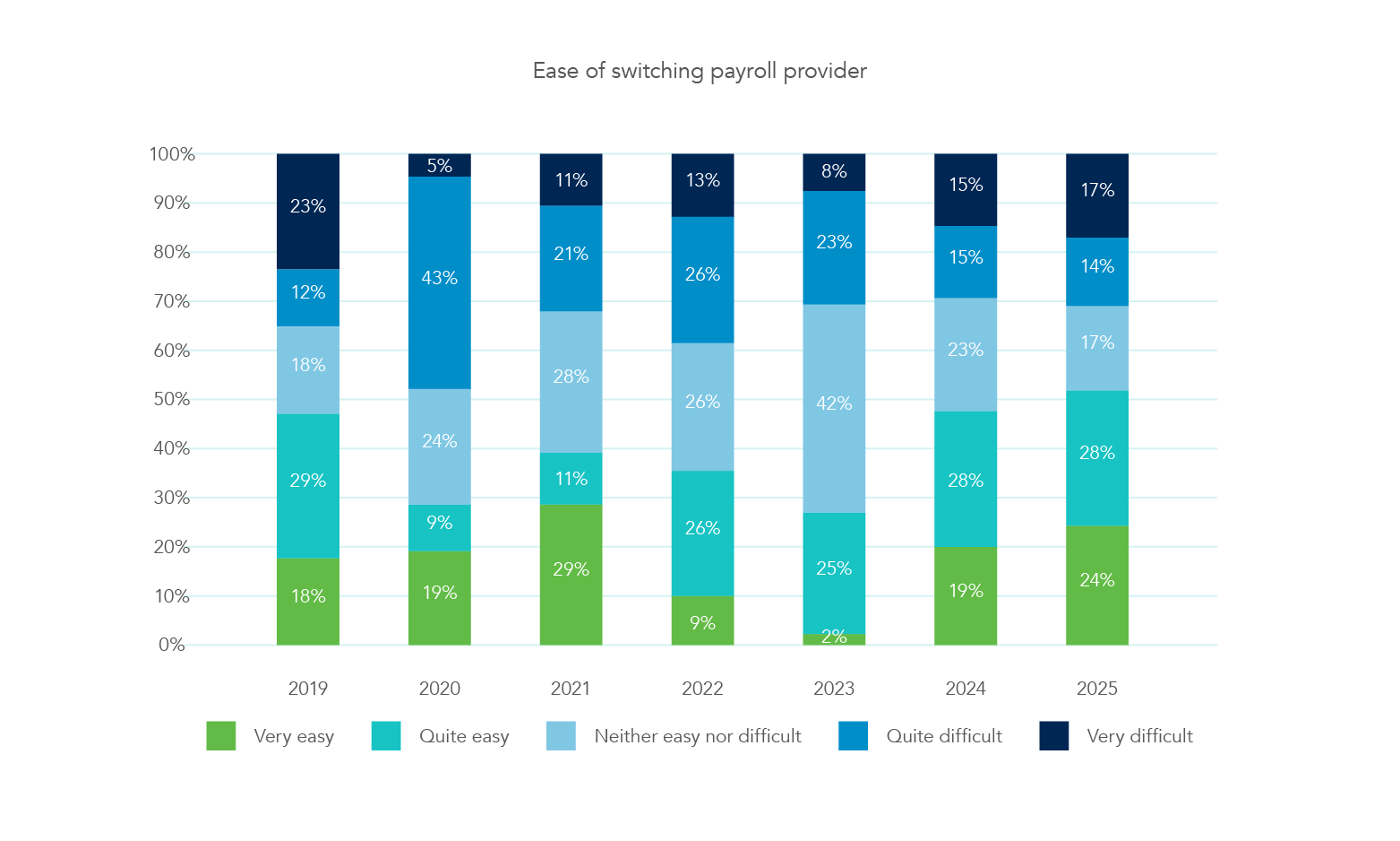 Respondents finding it very difficult to switch payroll providers increased to 17% in 2025 (+17% year-on-year). However, customers finding it quite difficult fell by -7%, continuing a downwards trend.