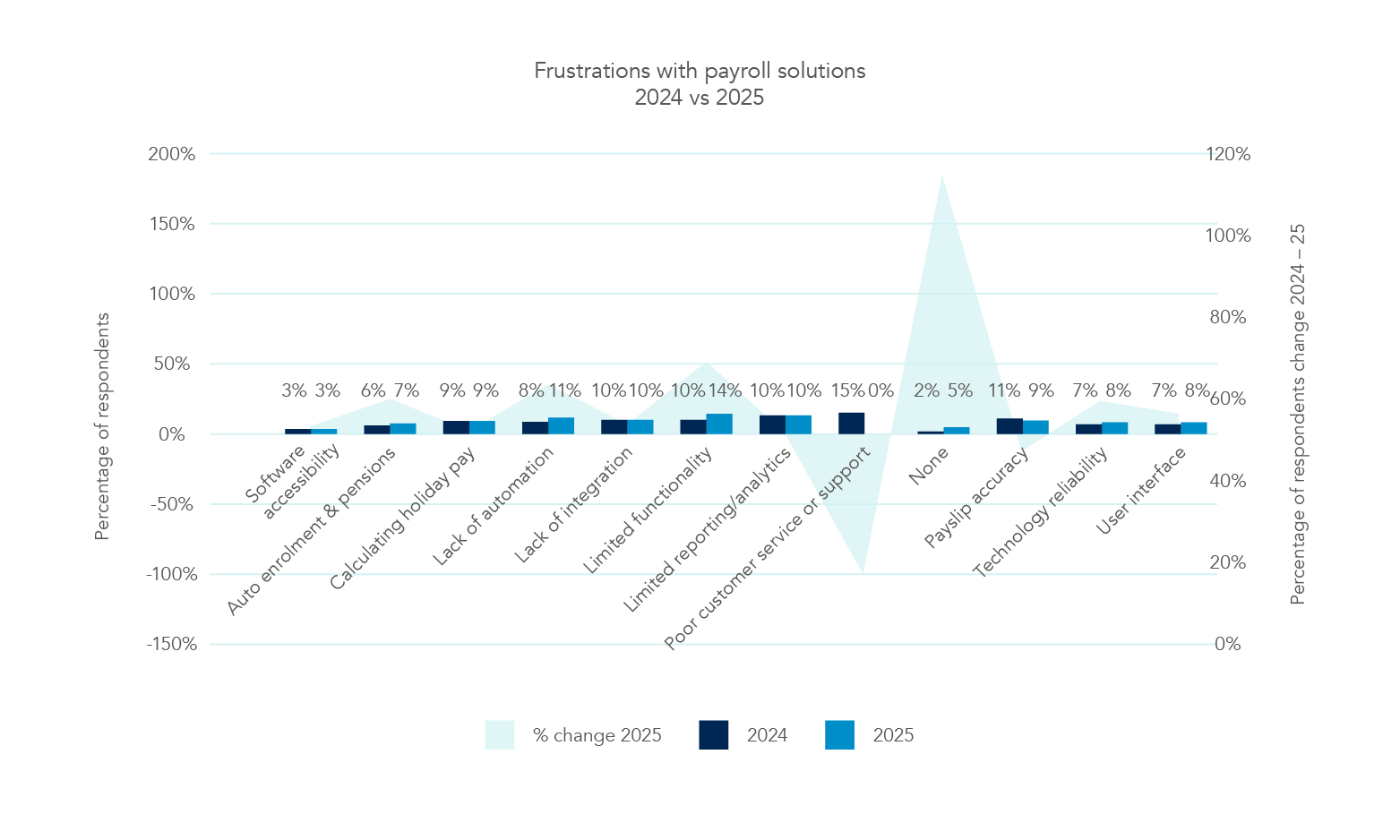 Frustrations with payroll have increased by 20% in 2025, with the most common frustrations being limited functionality (14%) and limited reporting/analytics (13%).