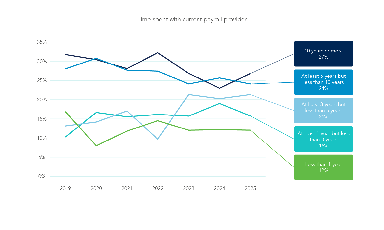 Long-term loyalty with providers is rebounding, rising sharply to 27% in 2025 after a dip in 2023-24. This suggests a renewed trend towards long-term relationships with payroll providers after previous volatility. Are retention strategies improving or are there barriers to switching?