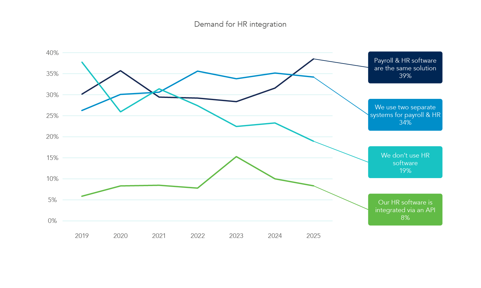 Using two separate systems of HR and payroll has decreased slightly this year (-2.5%), in line with more users favouring integrated solutions.
