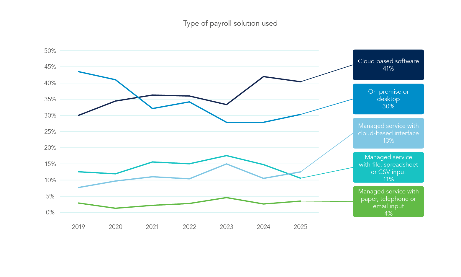 Cloud based software remains the most popular solution year-on-year, with 41% of Moorepay’s survey respondents preferring this solution in 2025.