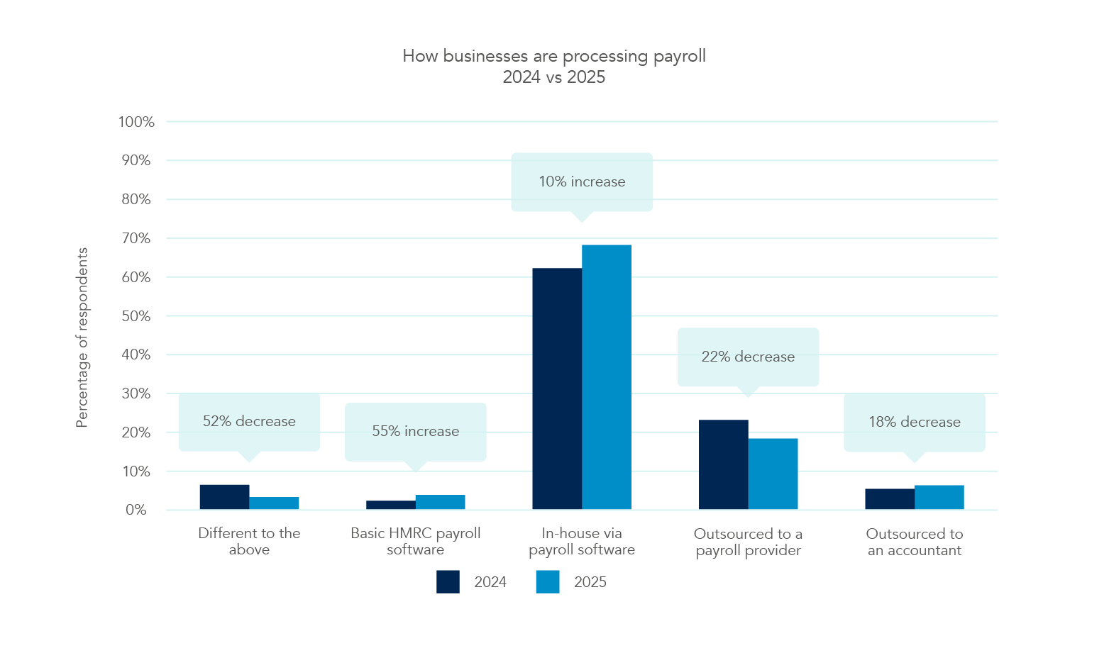 Outsourcing payroll to a provider has continued to decrease in 2025 (-22%). Conversely, outsourcing payroll to an accountant has seen an 18% increase, though only 6% of respondents choose to process their payroll this way.
