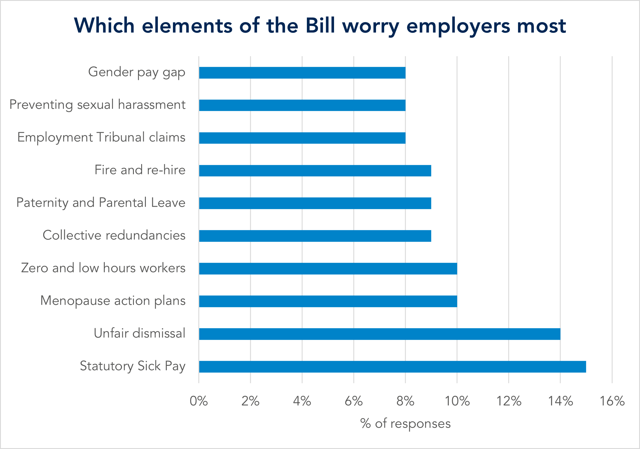 When asked “Which elements of the Bill worry you most?”, the most common answer was statutory sick pay at 15%, closely followed by unfair dismissal at 14%. However, all answers were selected by a proportion of respondents – showing each aspect of the Bill worries at least some employers.