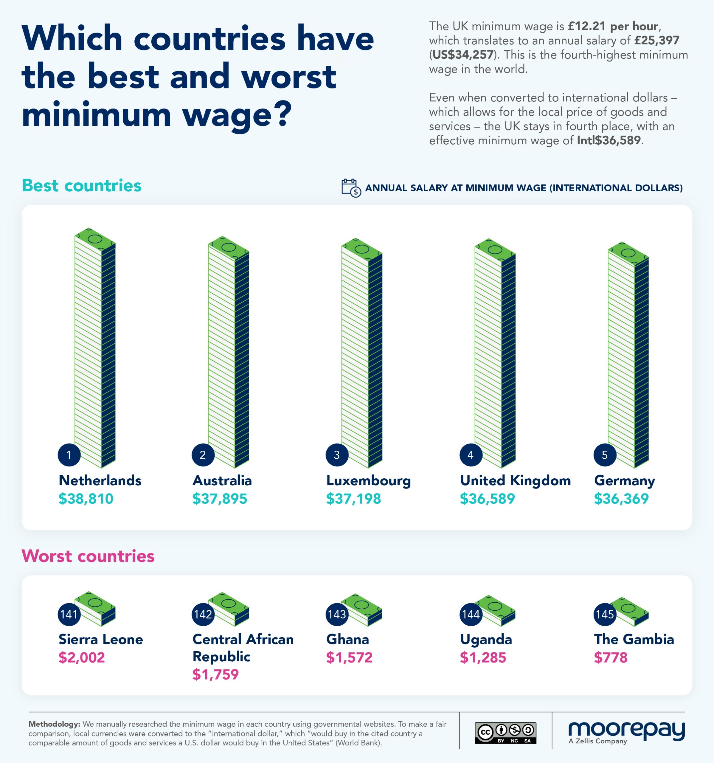 To find out, Moorepay manually researched the current statutory minimum wage in every country using government sources and converted these figures into annual salaries. To make a fair comparison, we then converted these local salaries into international dollars using the Purchasing Power Parity conversion factors for each country. The international dollar is a hypothetical currency the World Bank uses to create a realistic comparison of the buying power of local currencies. It reflects “the comparable amount of goods and services a U.S. dollar would buy in the United States.”
