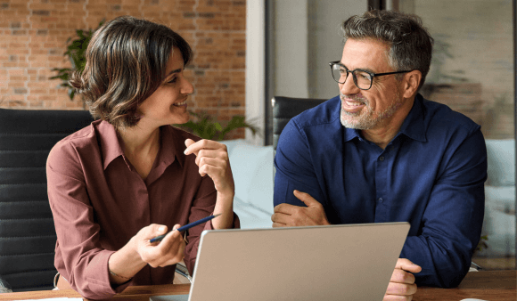 Diverse business colleagues sitting at a desk in a modern office talking together over a laptop.